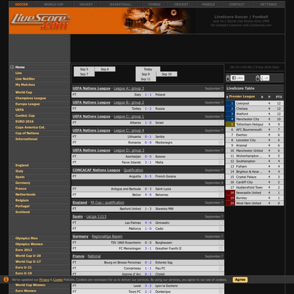 Australian football or south african psl. Find all live scores, fixtures and the latest news. Follow more than 1000 soccer competitions live on soccerstand.com! Livescore football results service plus football betting advice and free bets from all the major bookmakers, as well as match statistics, league tables, historical head 2 heads, team form, goal scorers and other data from all the major soccer leagues and competitions. The football livescore service is real time, you don't need to refresh it. Grazie all'allarme nella sezione personalizza potrai essere aggiornato del cambiamento dei risultati delle partite di tuo interesse in diretta! We would like to show you a description here but the site won't allow us. Risultati in tempo reale di calcio su diretta.it il nuovo livescore di risultati e partite di calcio in diretta da serie a, serie b,, coppa italia, primavera 1 e altri 1000 campionati. Live tennis scores are brought to you in real me by livescorehunter.com, directly onto your screen, live real ?me scores and results. In this version with nearly no adverts and the same speed. On flashscore.com you can find english premier league livescore, serie a results, bundesliga scores, mls, mexican football league, and e.g. Pick your matches and enjoy the speed of this great offer. Livescore, latest results, standings, fixtures, h2h stats and odds comparison.
